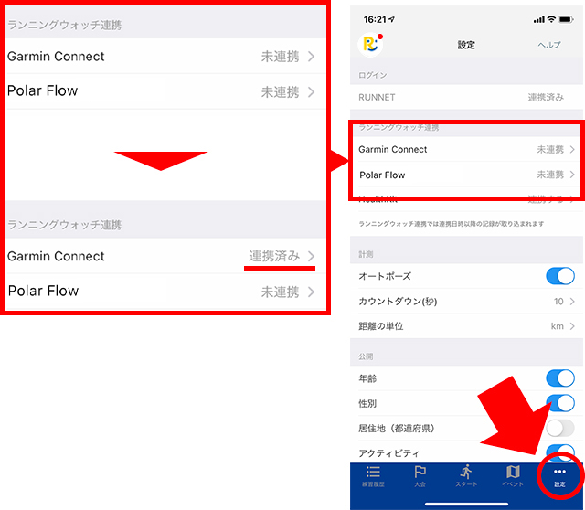 - 画面右下の[設定]をタップ。[Garmin Connect]または[Pola Flow]をタップしてください。