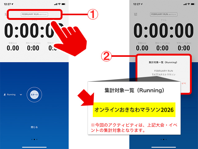 - ②の集計対象一覧に「オンラインおきなわマラソン2026」が含まれていることを確認してください。